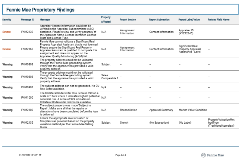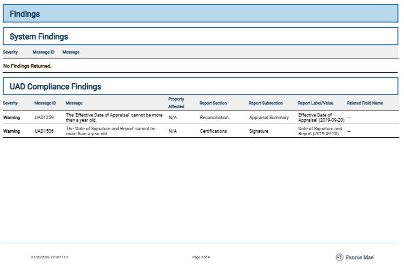 To view the results, access the output via the Communications Log or Documents tab. UCDP has redesigned the output(s) to align with the UAD 3.6 modernization application in a decipherable format. Below is an example of how the new outputs may appear. NOTE: UCDP will no longer permit overriding hard stops. Any Severity returned as a 'Fatal' finding from Fannie Mae® or Freddie Mac® must result in an updated appraisal submission.